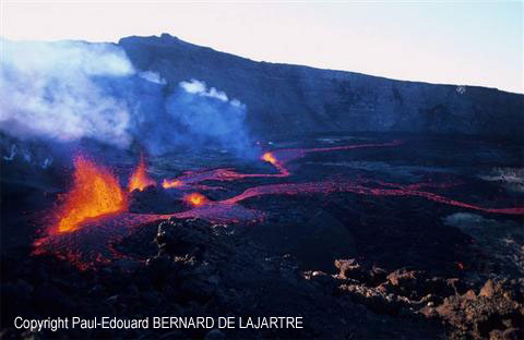 F 9 : 3 fissures se sont ouvertes, d'où s'échappent des projections de lave d'une quinzaine de mètres de hauteur.
